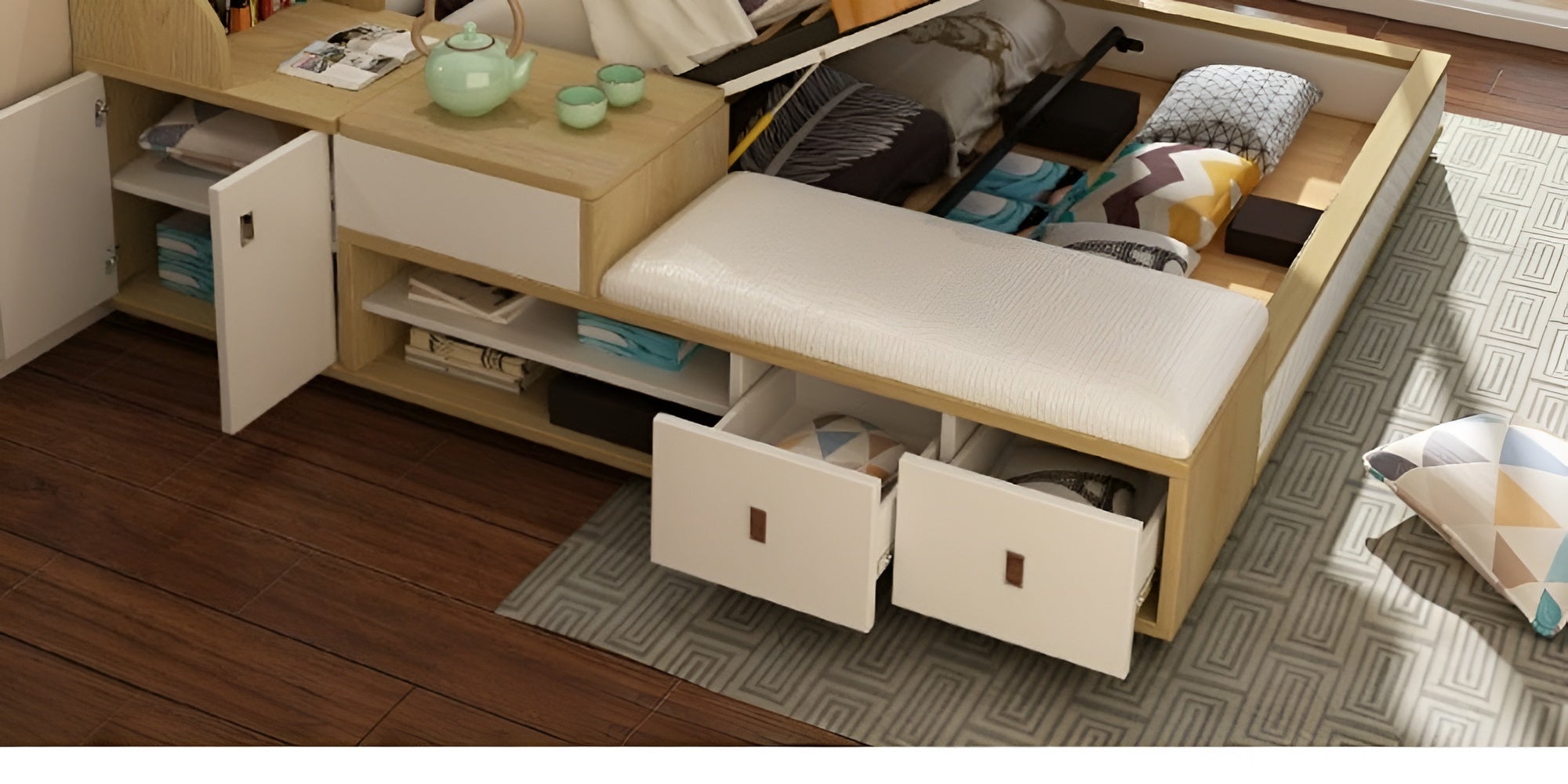 Additionally, this Modern Bed comes with a multipurpose laptop table that can be adjusted to suit your needs and doubles as a coffee table. The table improves comfort and functionality with a small sitting area and extra storage space for necessities. All things considered, this Modern Wooden Leather Bed with Drawers blends classic design with contemporary functionality, making it the ideal addition to any bedroom.