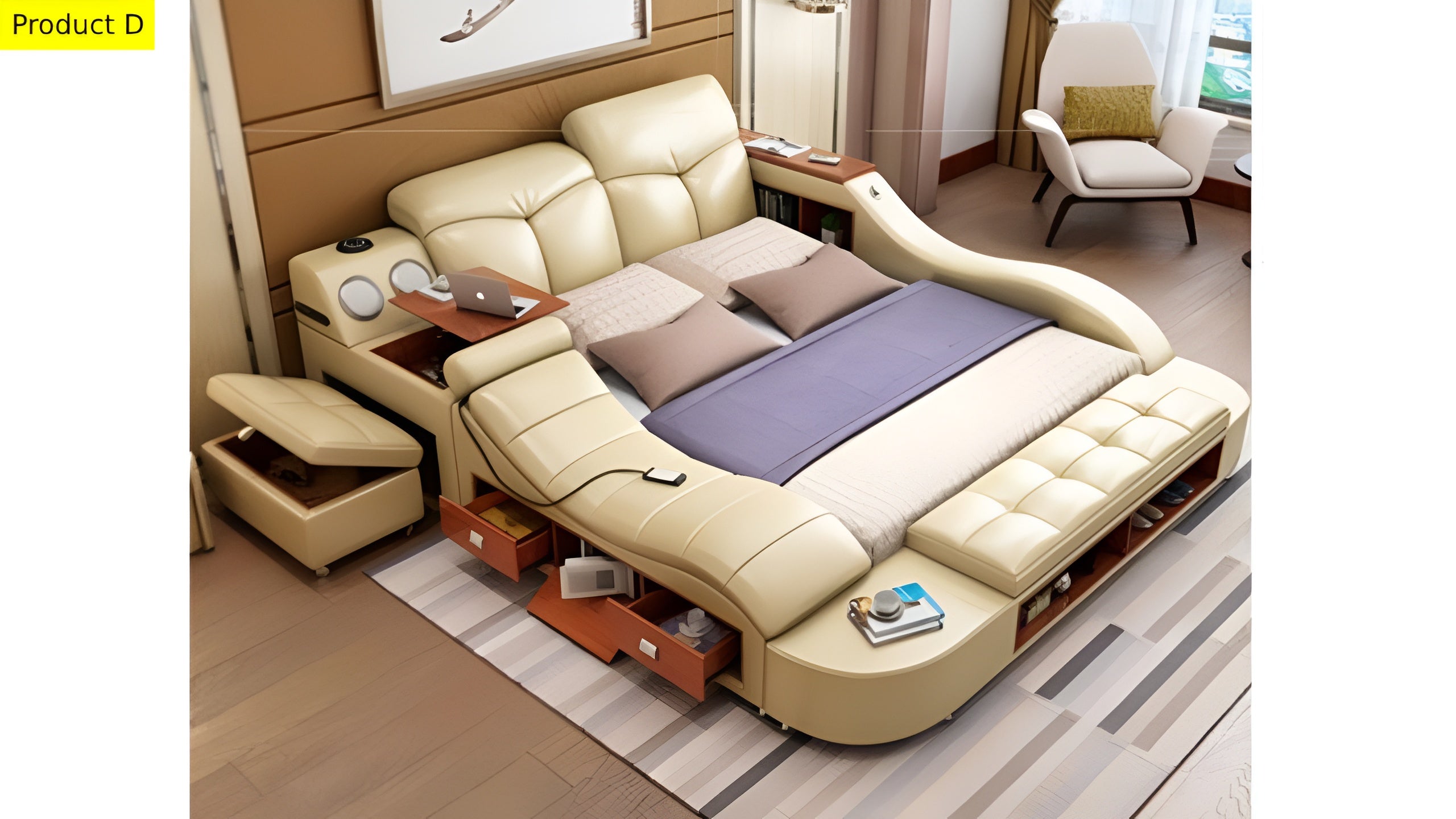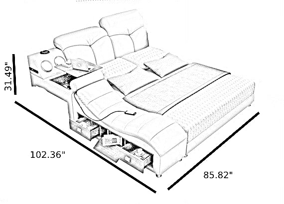 There is a hidden password safe inside which is fixedly connected to the Multifunctional Style Smart Leather Massager Bed, with high security. A foldable lifting storage table which can be also used as a coffee table, desktop, and computer table, is easy to use. It has a storage bed end-like cabinet shelves, shoe cabinet space, and an integrated multifunctional leather bed end stool.