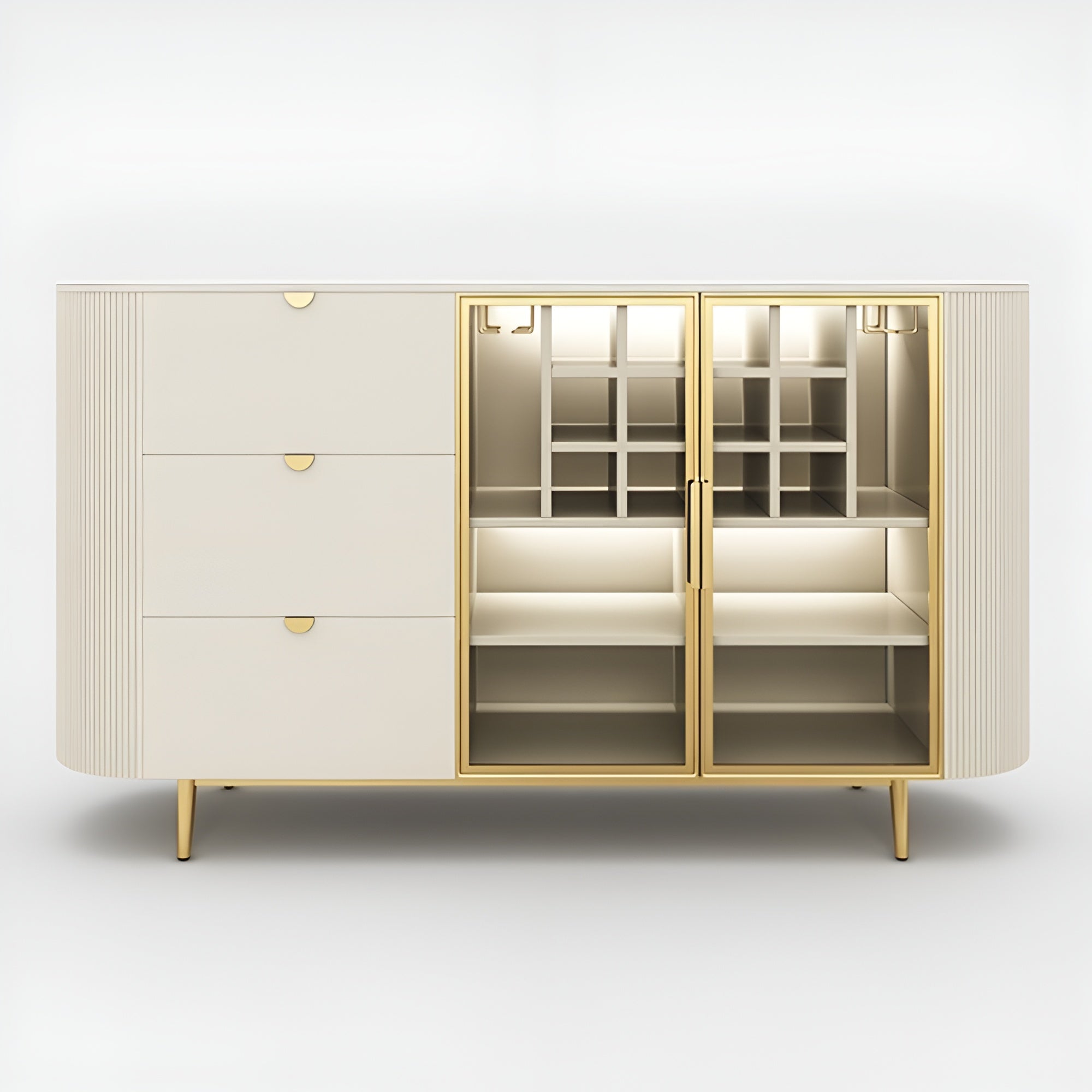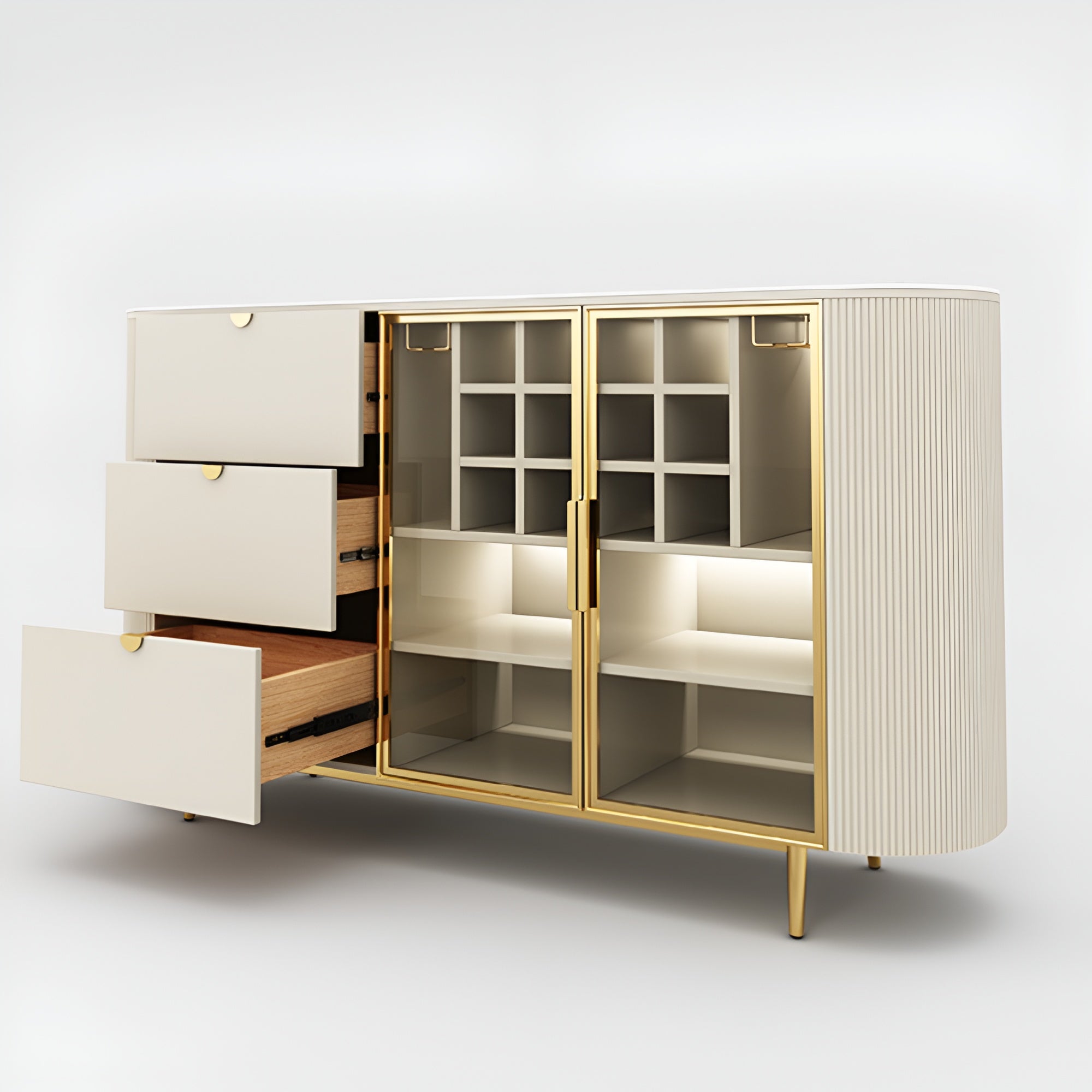 This marble Buffet Table includes built-in LED lights, beautifully illuminating your displayed items like glassware or decor behind the clear glass doors. The integrated wine rack keeps your bottles organized, while three spacious drawers offer discreet storage. Furthermore, it stands gracefully on metal legs, completing its contemporary design.