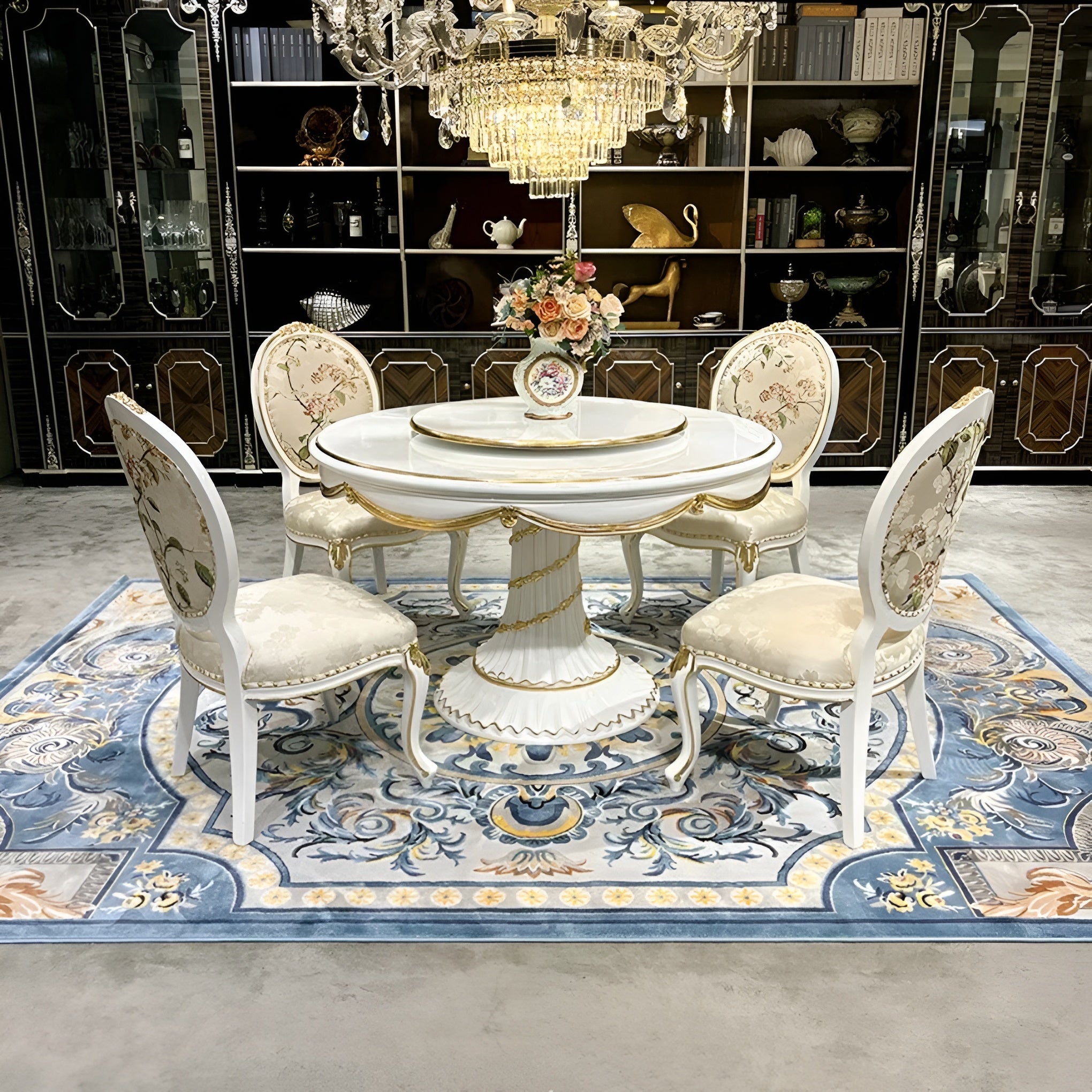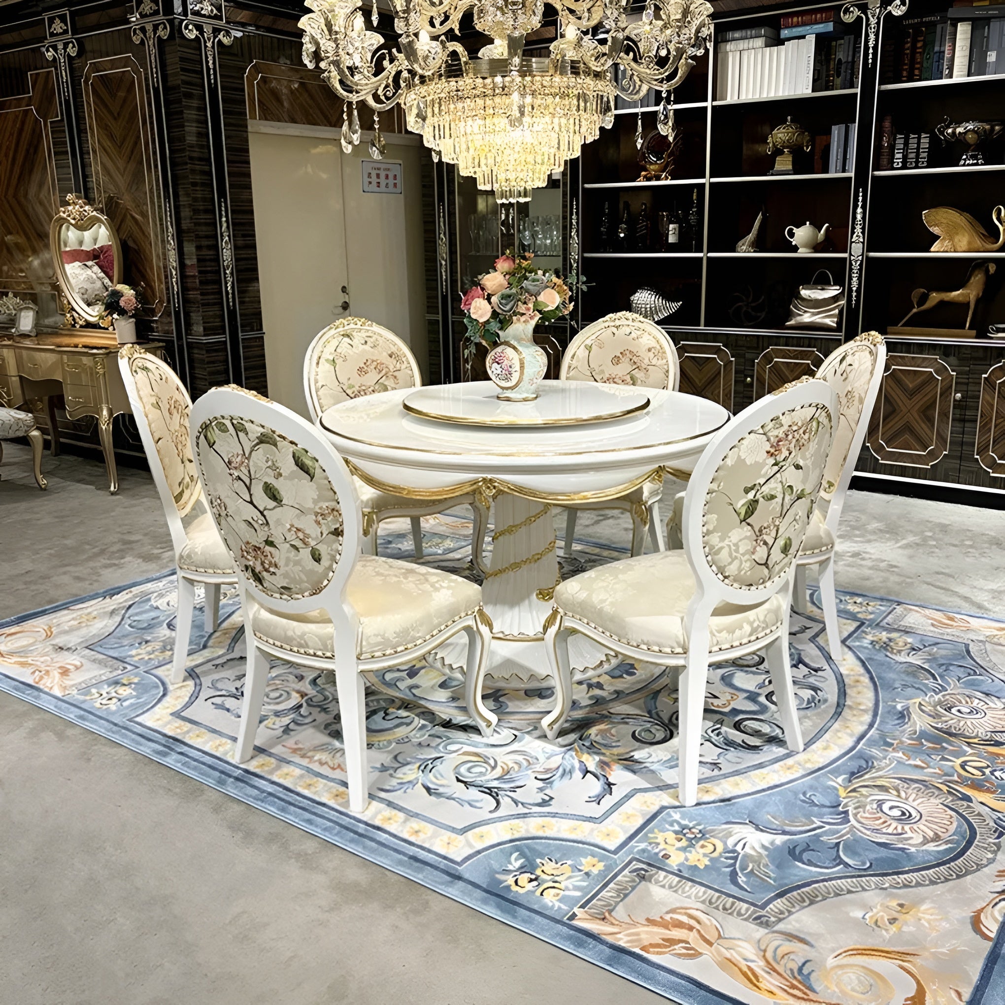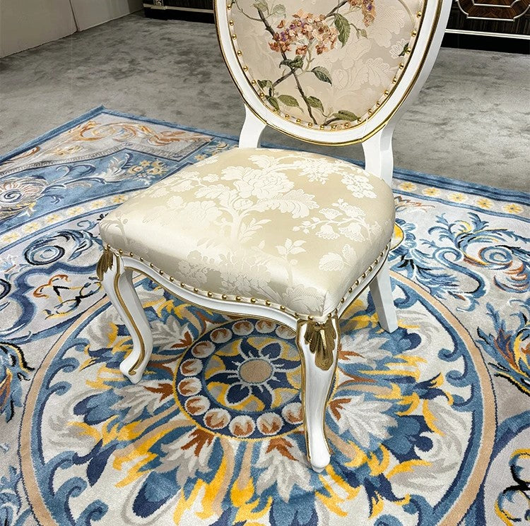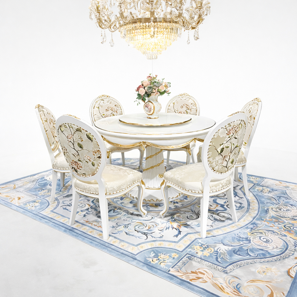 This Round European Wooden Dining Set with Gold Accents will add classic elegance to your house. This European Dining Set combines comfort and luxury, drawing inspiration from the traditional Brusten European style. Beautifully carved legs, a sturdy structure, and a long-lasting top characterize this solid wood table. Its circular shape incorporates a handy Lazy Susan, which enhances the practicality and enjoyment of family meals.