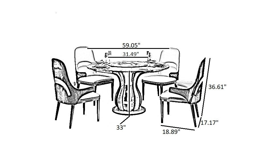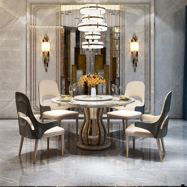 With our Round Marble Dining Table-Set with Lazy Susan, which has a built-in lazy susan for efficient serving, you can update your dining area. The luxurious marble Dining Table Set is supported with precision using a metal and wood framework for optimal longevity and attractiveness, which combines contemporary design with longevity. Comfort and style are combined in these chairs, which are upholstered in quality leather and held up by strong wood legs with metal caps.