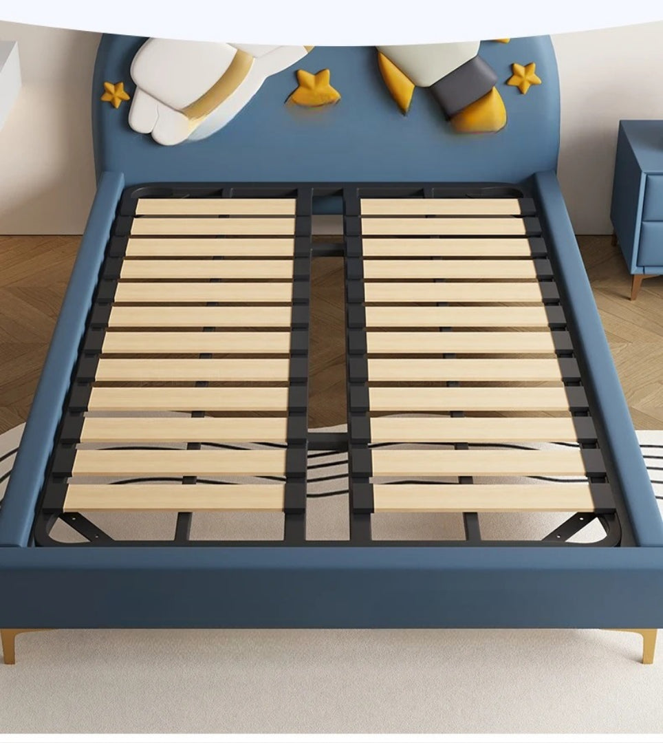 The modern design adds a unique touch to any room, making it perfect for kids who love space and adventure. The metal feet provide structural strength. Overall, This space design leather upholstery kid's bed is a functional and stylish piece of furniture that adds a touch of luxury and cosmic experience to a kid’s room.