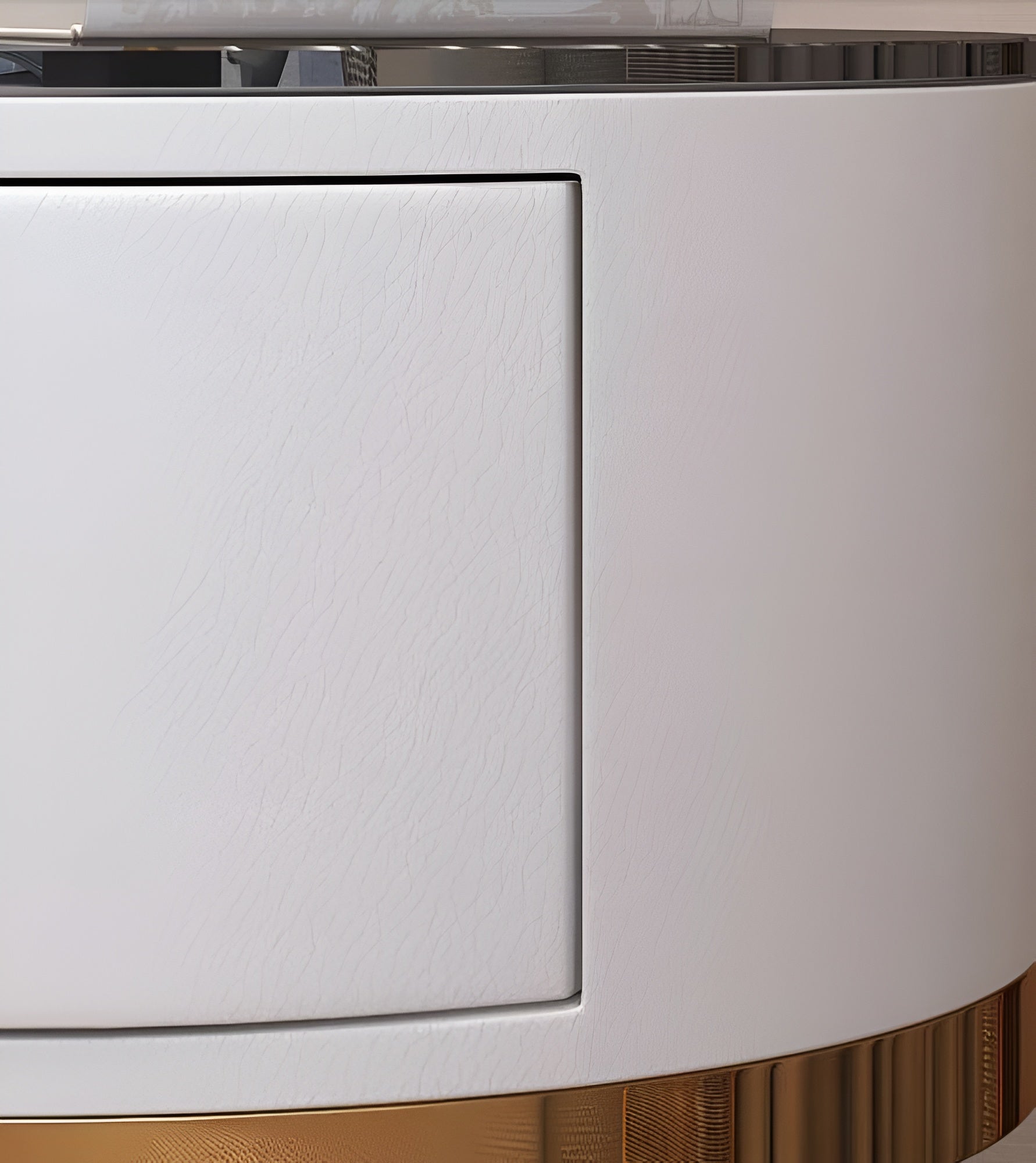 Elevate your bedroom with the Metal Base Luxury Glass Night Stand. This stunning piece combines style and function perfectly. First, the lavish glass table top offers a polished look. Next, the solid wood structure of this luxury night stand comes upholstered with leather and metal accents, providing a refined and soft finish. Moreover, the sturdy metal base ensures stability while adding golden elegance.