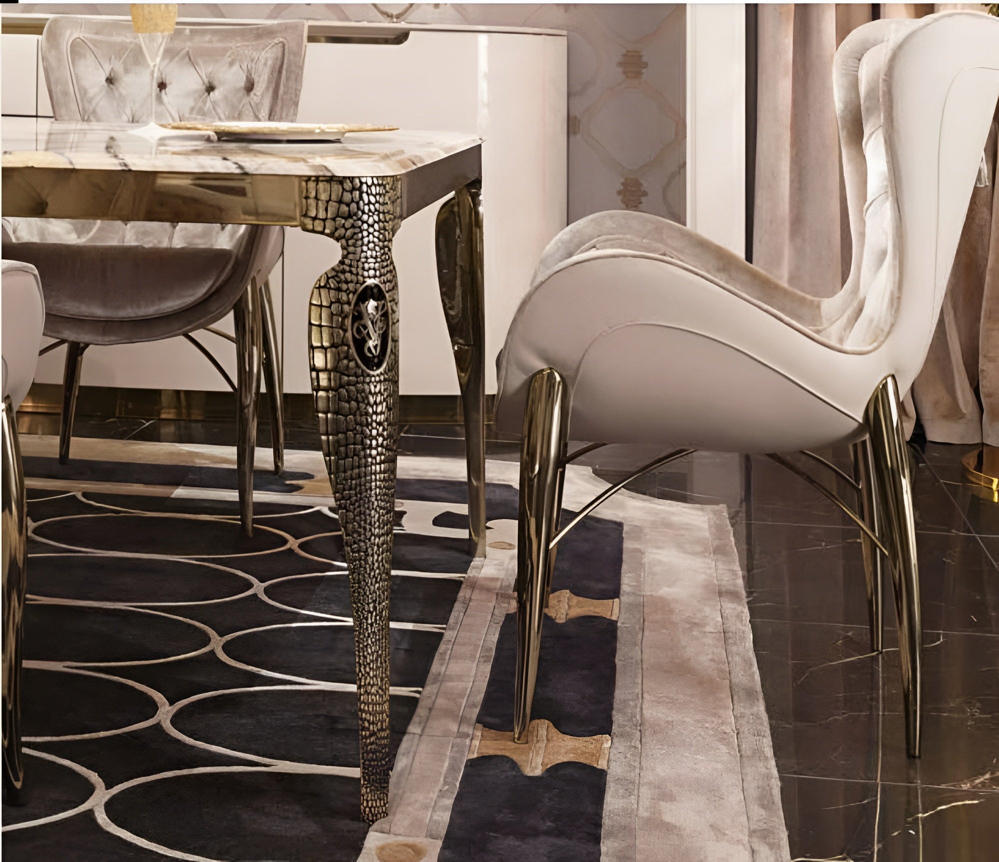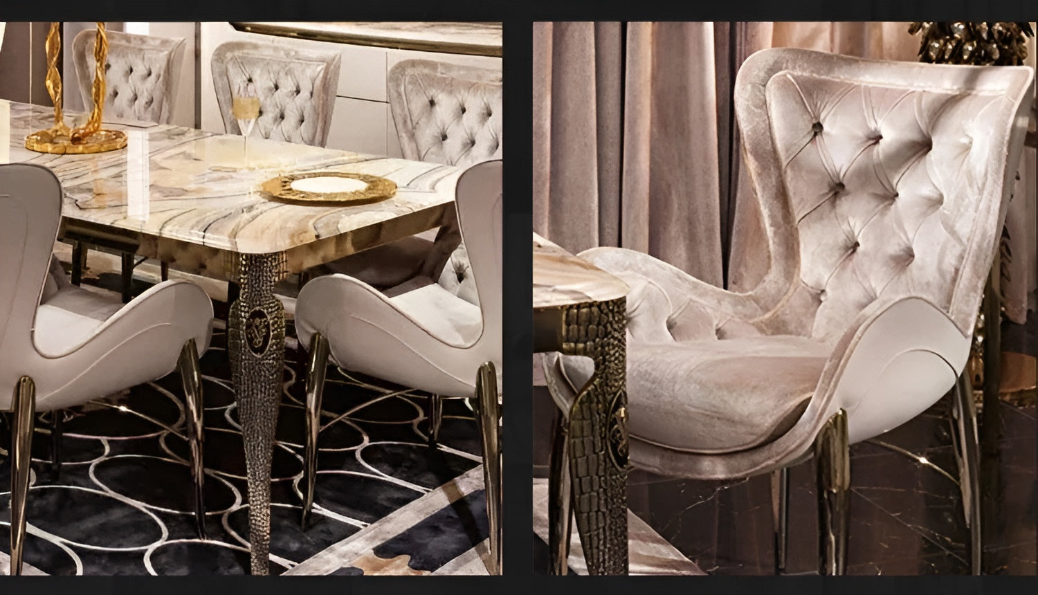 The chair's legs and metal frame provide sturdy support, and its soft velvet upholstery encourages rest. The Dining Table Set's sophisticated design goes well with both formal and informal settings, making it perfect for contemporary homes. The Ultramodern Marble-Top Dining Table Set is the ideal focal point for your house, whether you're entertaining or just spending time with your family. Make enduring memories in style and comfort!