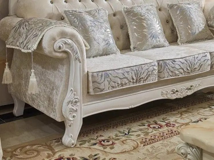 The button tufted designs on the sofa backrest make the sofa more beautiful and glossy. The European Fabric Sofa set consists of beautiful six matching pillows, giving a more appropriate look and artistic touch. The durable construction ensures that the White European Living Room Fabric Sofa Set will remain a centerpiece for attraction in homes for years to come.